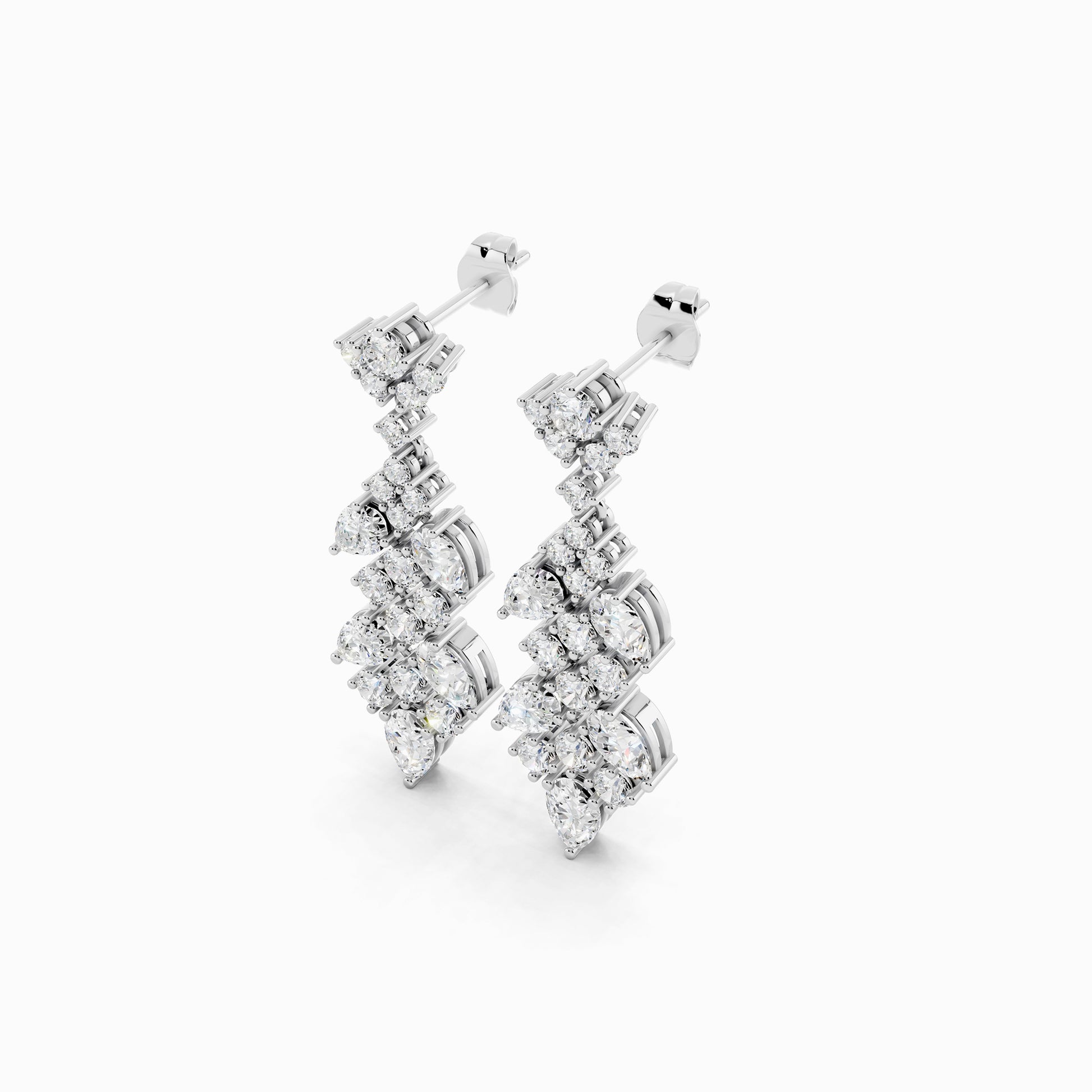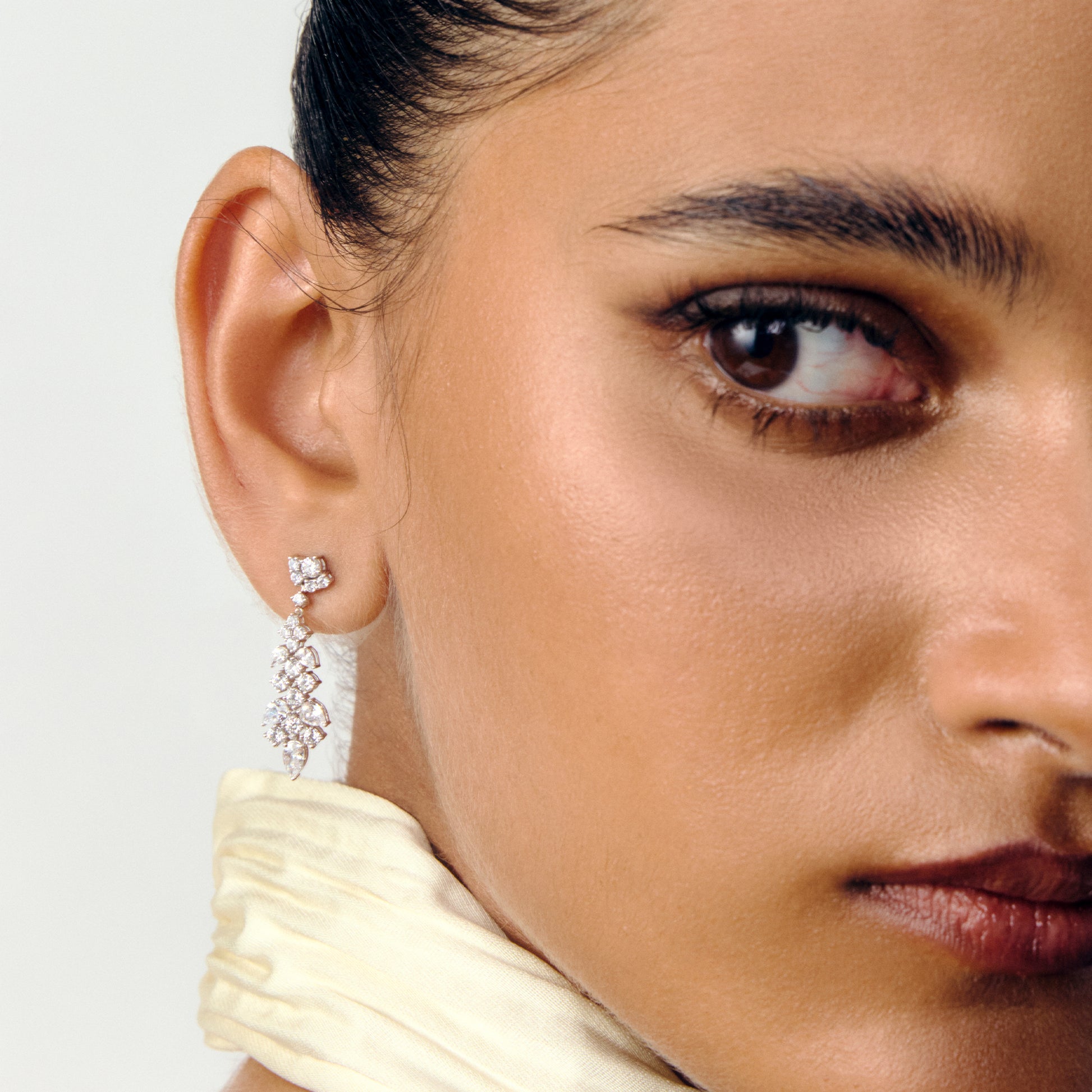 Callista cluster earrings feature 44 pear and round-cut diamonds totaling 3 carats, reflecting the shimmer of morning dew on fresh petals.