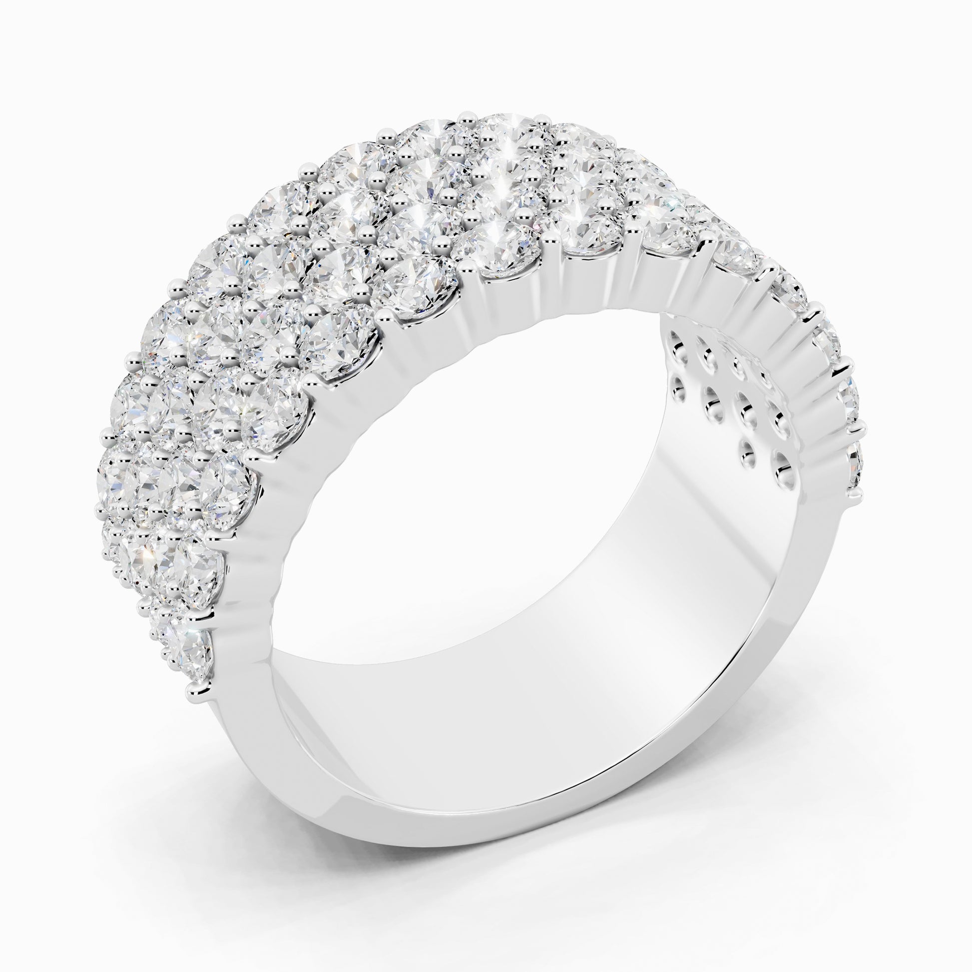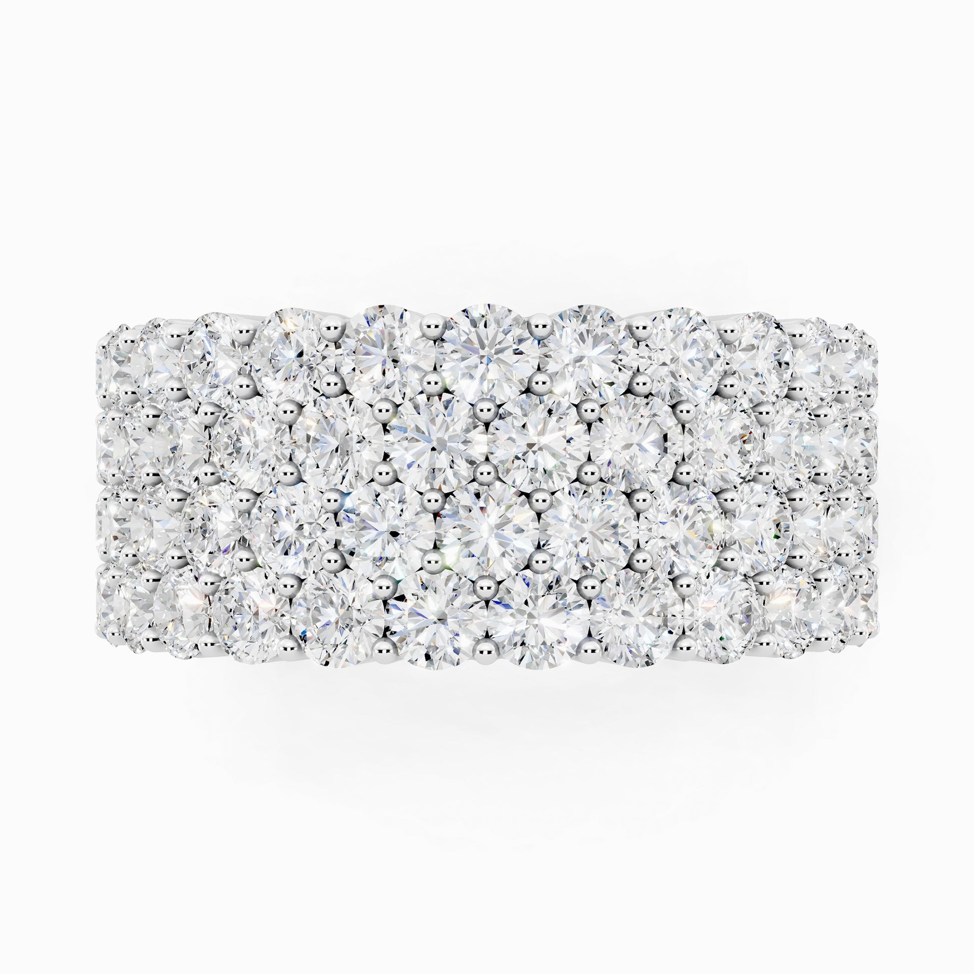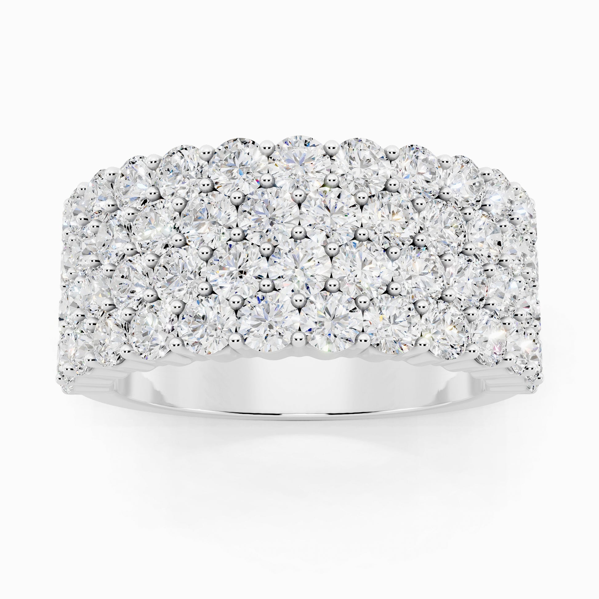 Like love layered in time, the Geranium lab grown diamond ring features four rows of shimmering 58 round diamonds, totaling 3.42 carats, set in a half-eternity design. Crafted for the bride who embraces elegance wrapped in effortless luxury.