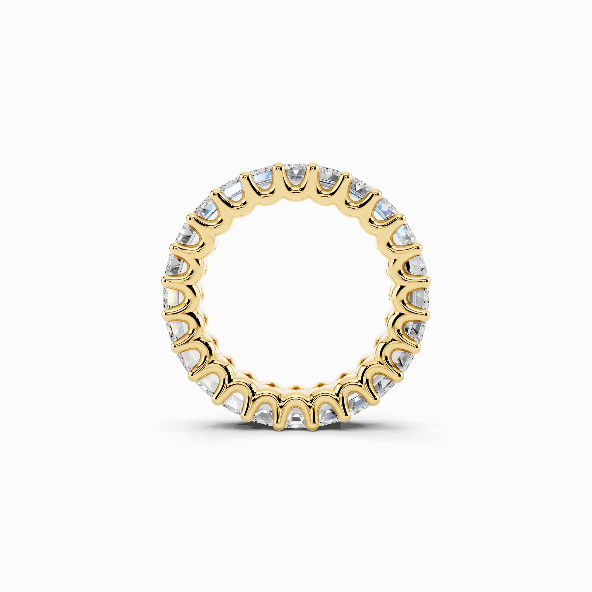 The Lantana eternity emerald cut wedding ring shines with 24 emerald-cut diamonds totaling 4.8 carats. Crafted in a seamless eternity design, it forms infinite chapters of never-ending love, a luminous symbol of devotion that lasts forever.