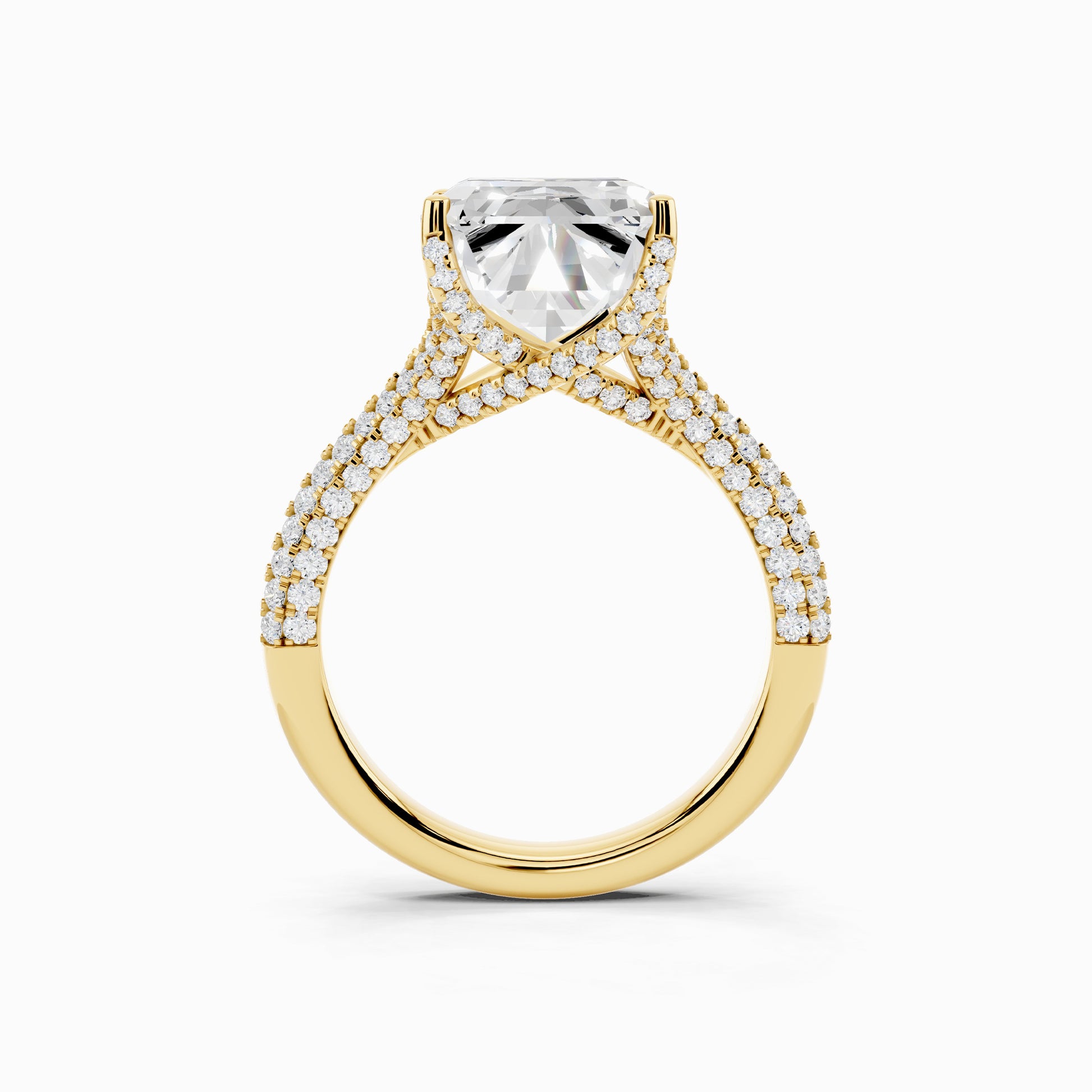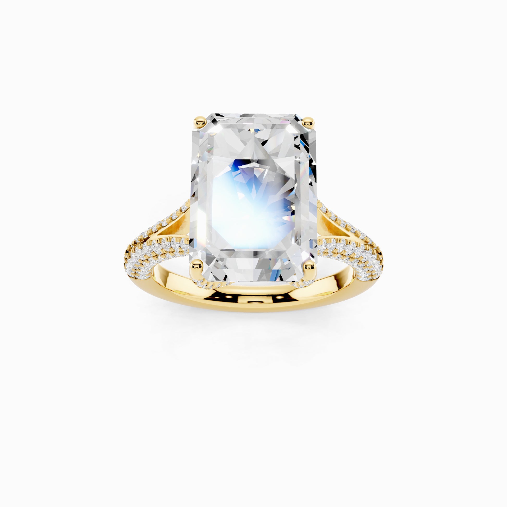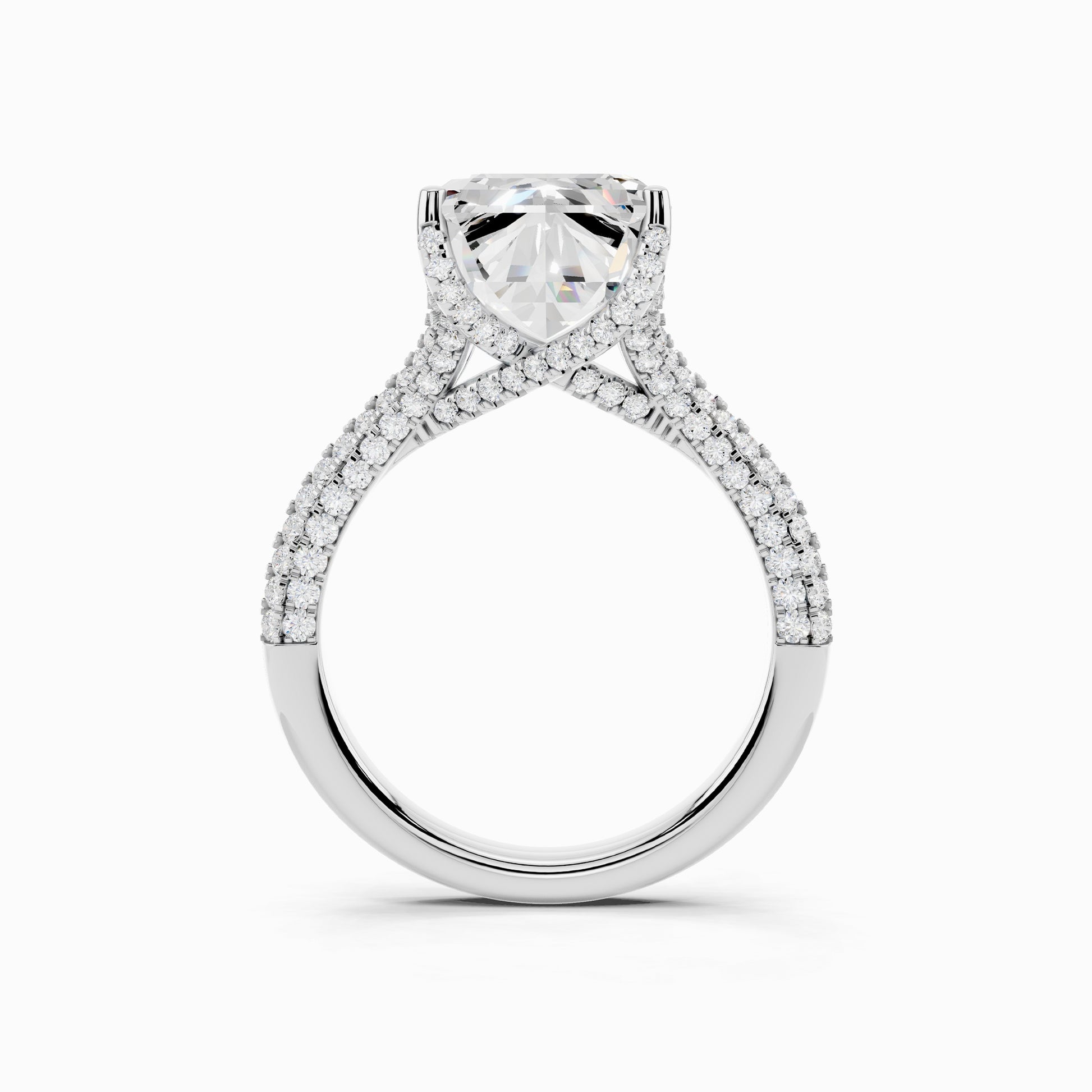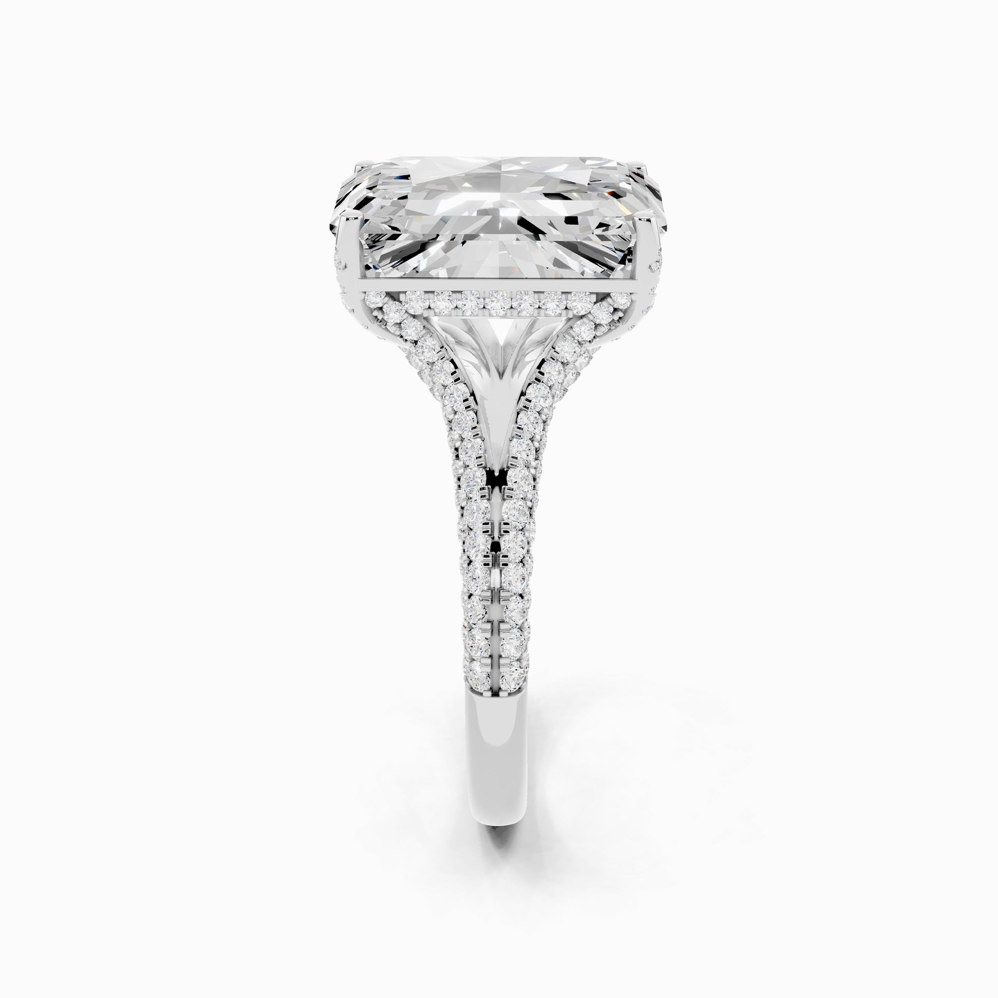 Inspired by the Silene flower, this Silene lab grown diamond ring features a stunning 5-carat radiant cut diamond framed by a double split shank, adorned with 168 round diamonds that shimmer gracefully along the half band. A radiant treasure for life’s most unforgettable moment.