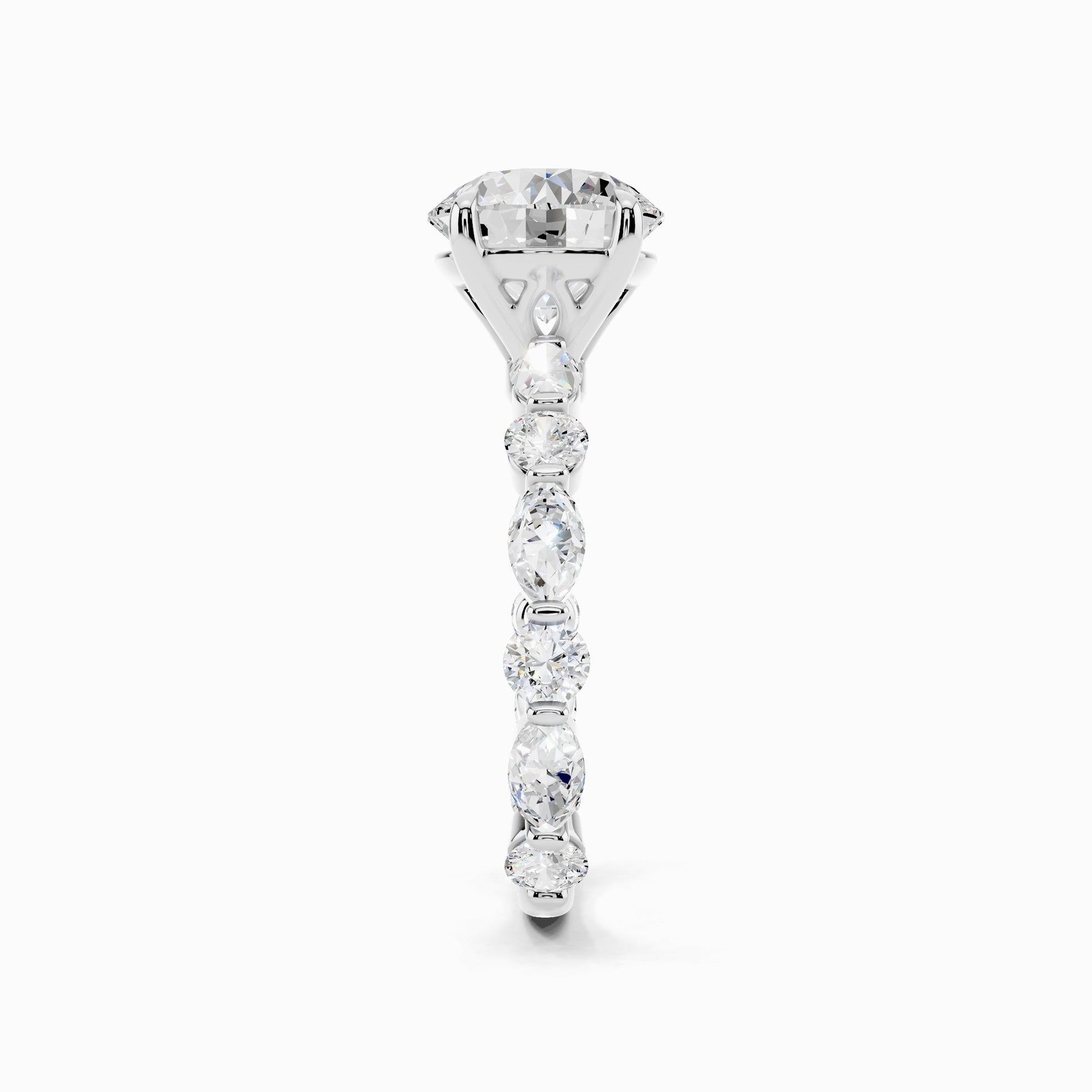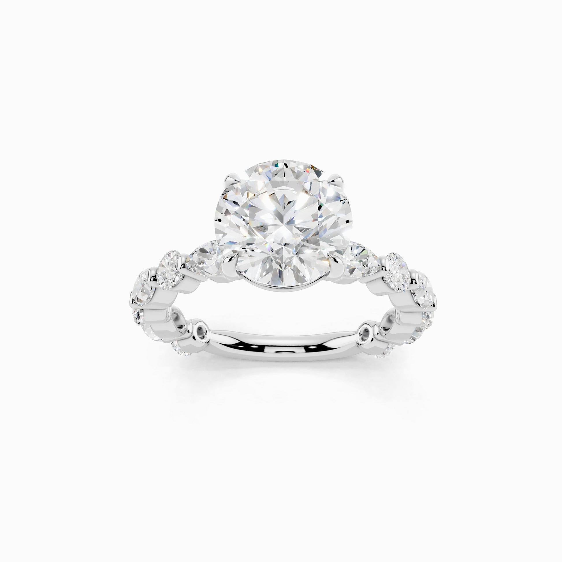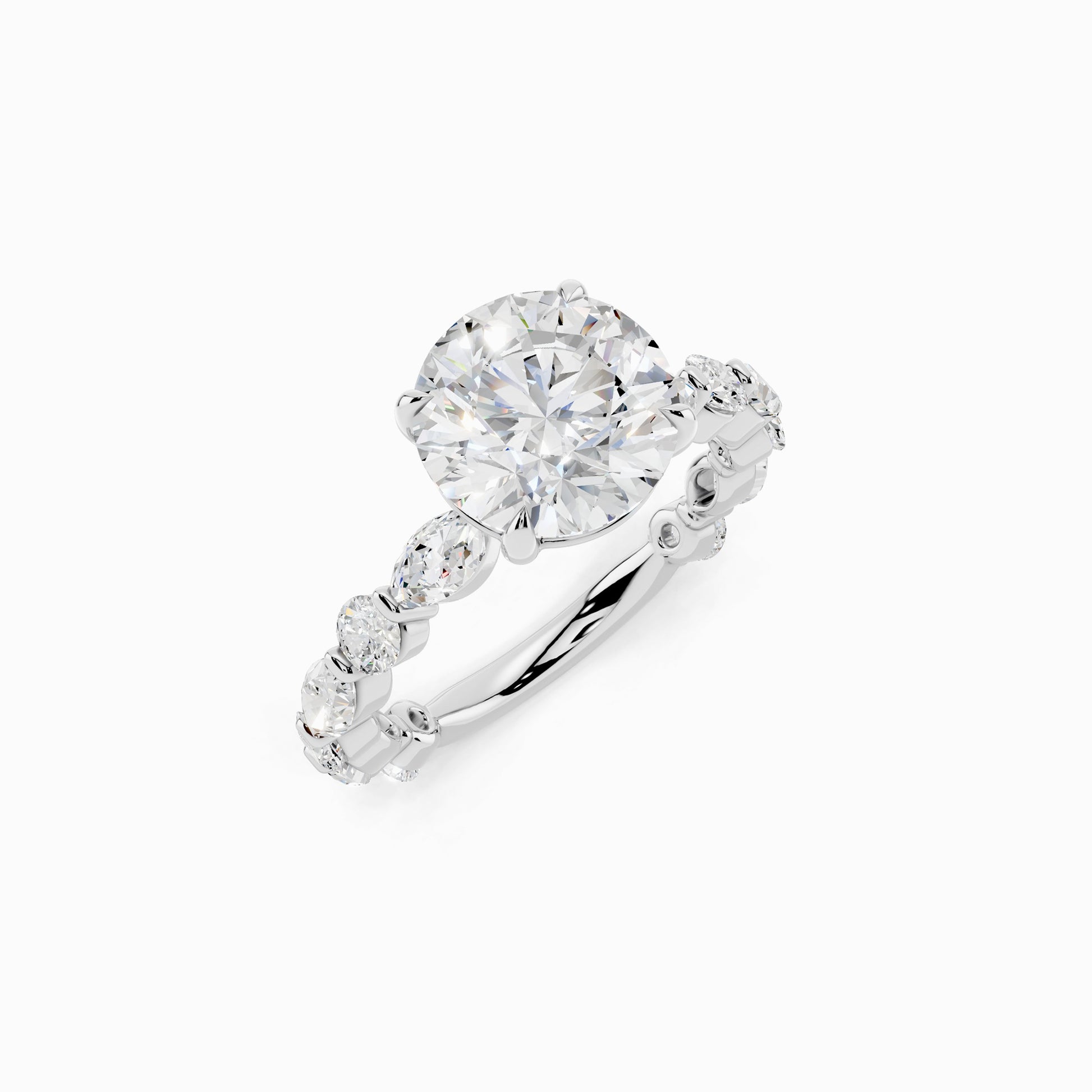 Celebrate your special day with the 3.5-carat round-cut Sira engagement ring. At its heart shines a breathtaking 2.5-carat round diamond, while the band shimmers with 12 round and marquise diamonds, together 1 carat, completing a design that sparkles with perfection for the moment you say “forever.”