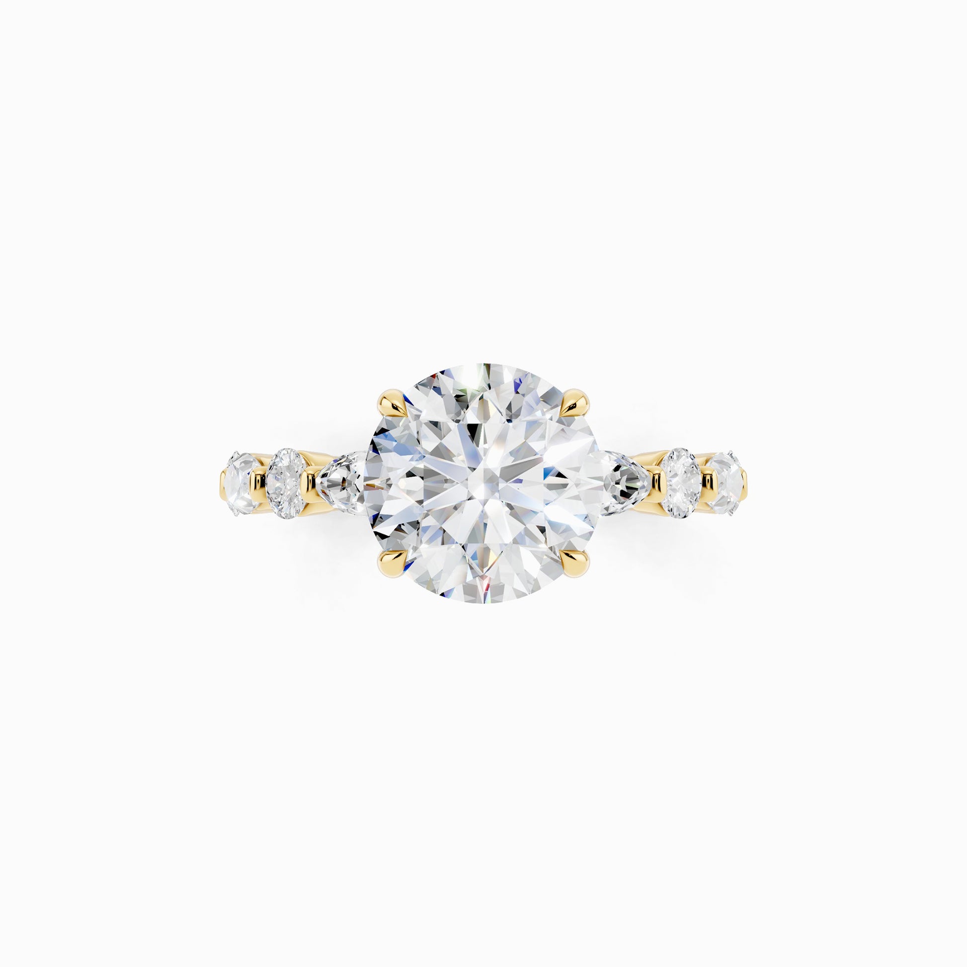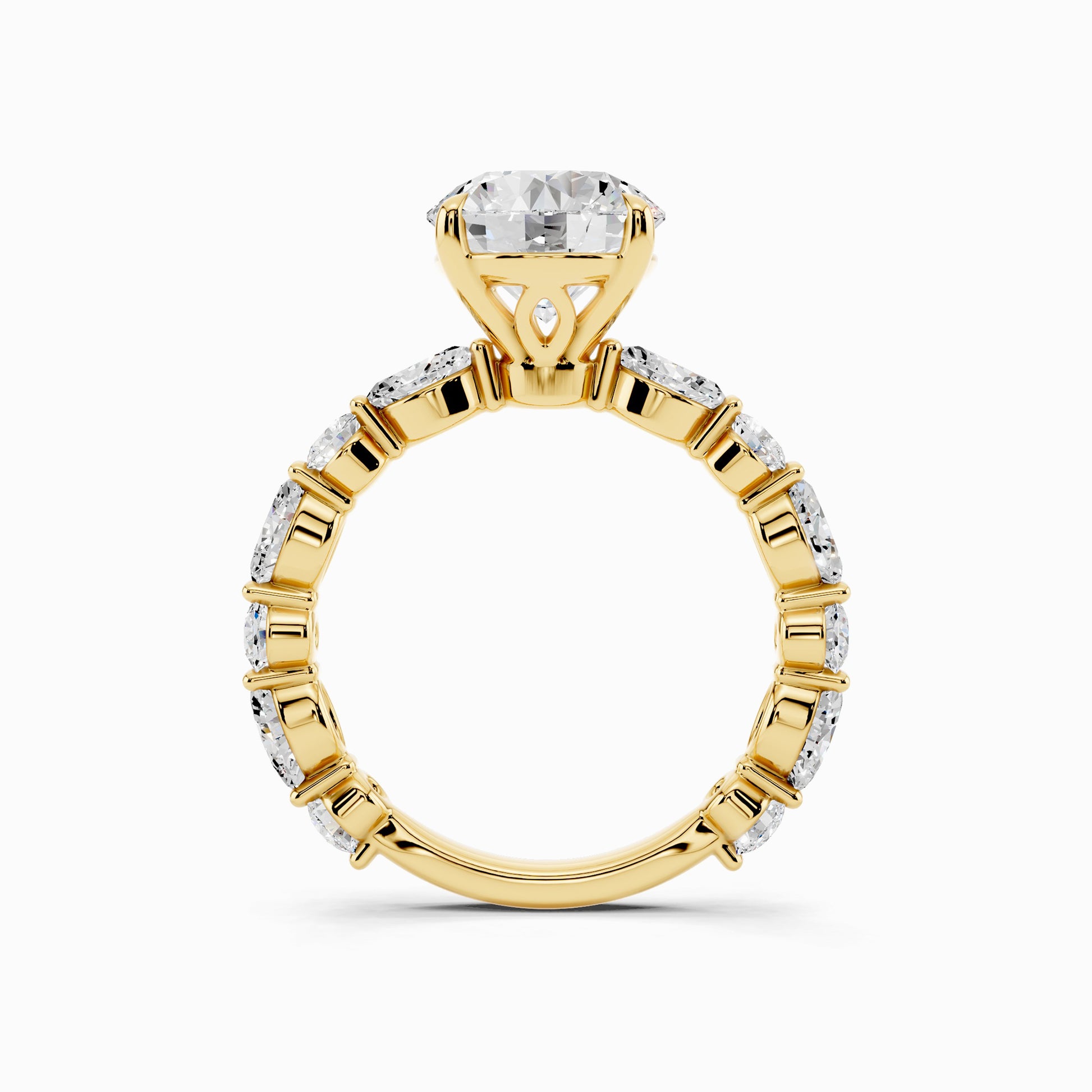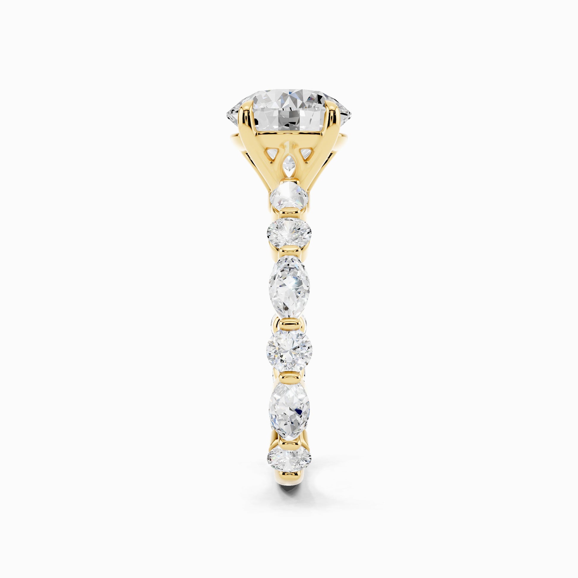 Celebrate your special day with the 3.5-carat round-cut Sira engagement ring. At its heart shines a breathtaking 2.5-carat round diamond, while the band shimmers with 12 round and marquise diamonds, together 1 carat, completing a design that sparkles with perfection for the moment you say “forever.”