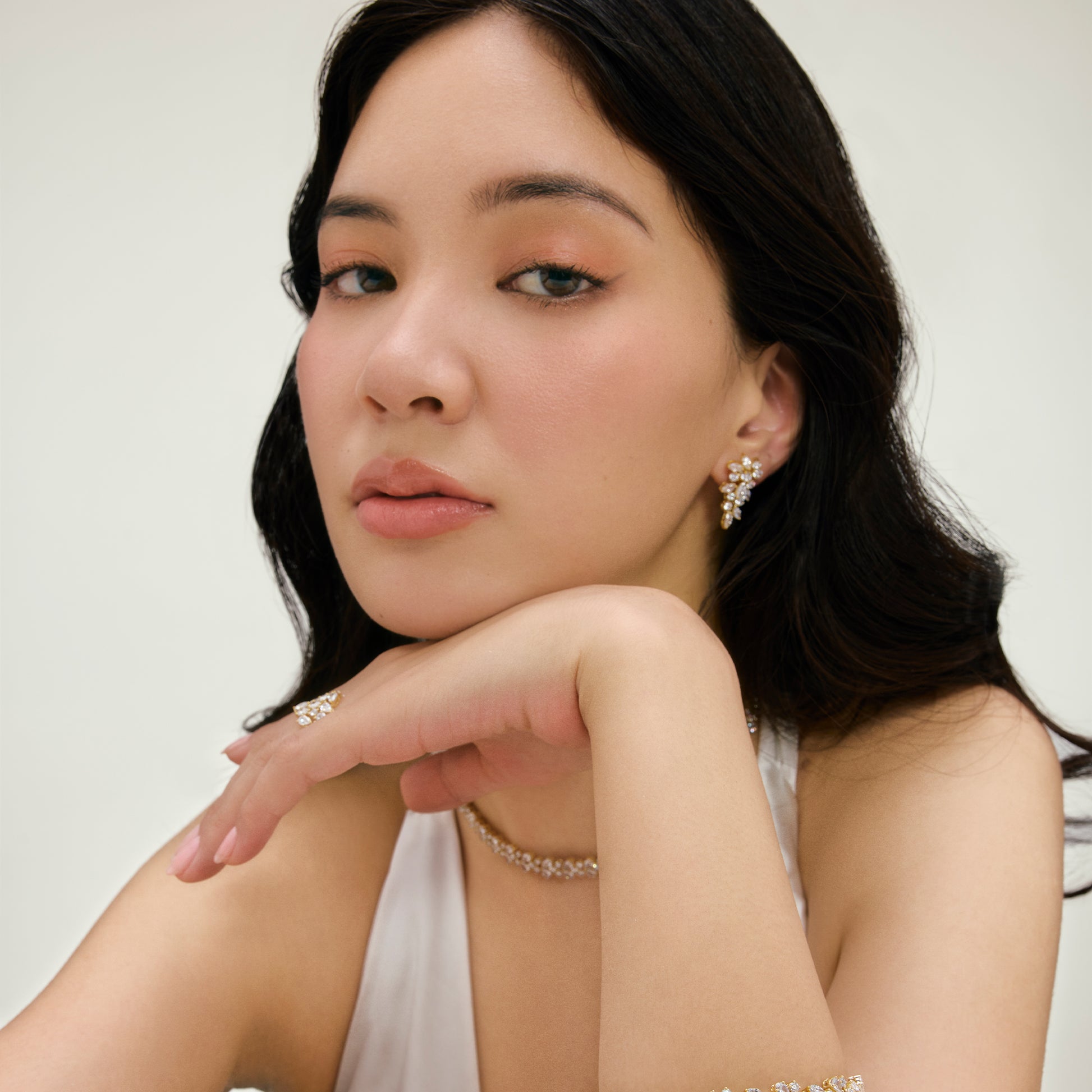 Vinca cluster earrings feature 30 diamonds in a delicate combination of marquise and round cuts, totaling 3 carats. Arranged in a radiant cluster, the design reflects the layered beauty of the Vinca flower, revealing refined elegance from every angle.