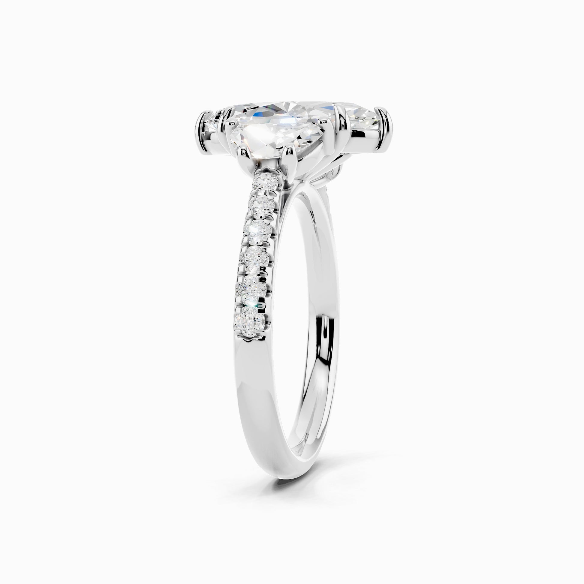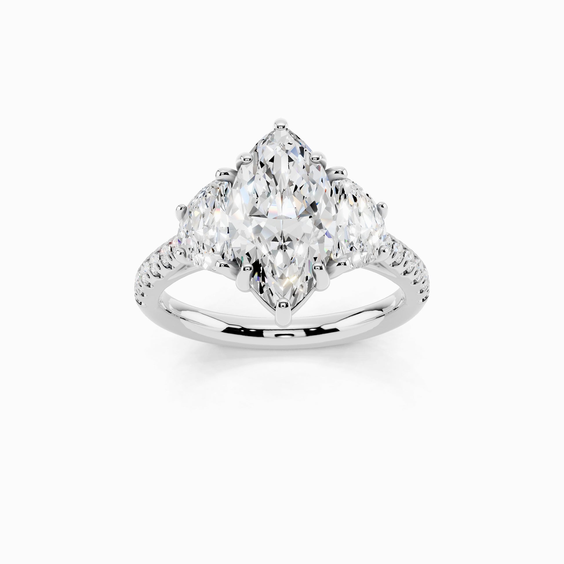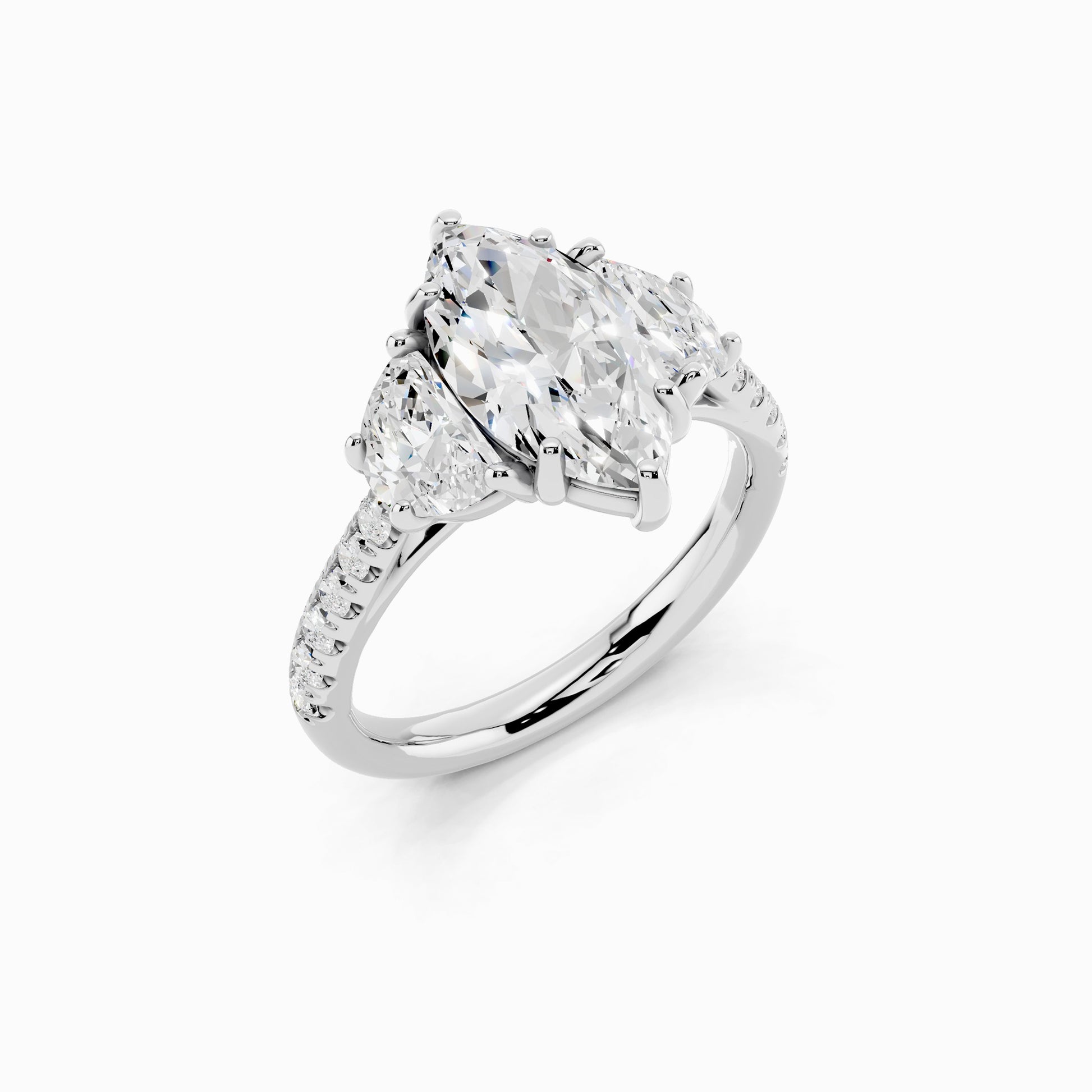 The 3.22 carat Zyla engagement ring features a 2-carat marquise cut lab grown center stone, flanked by half-moon diamonds that cradle it in perfect harmony. The band, adorned with a continuous line of round-cut diamonds, adds a luminous flow symboling the promise of love in its most dazzling form.