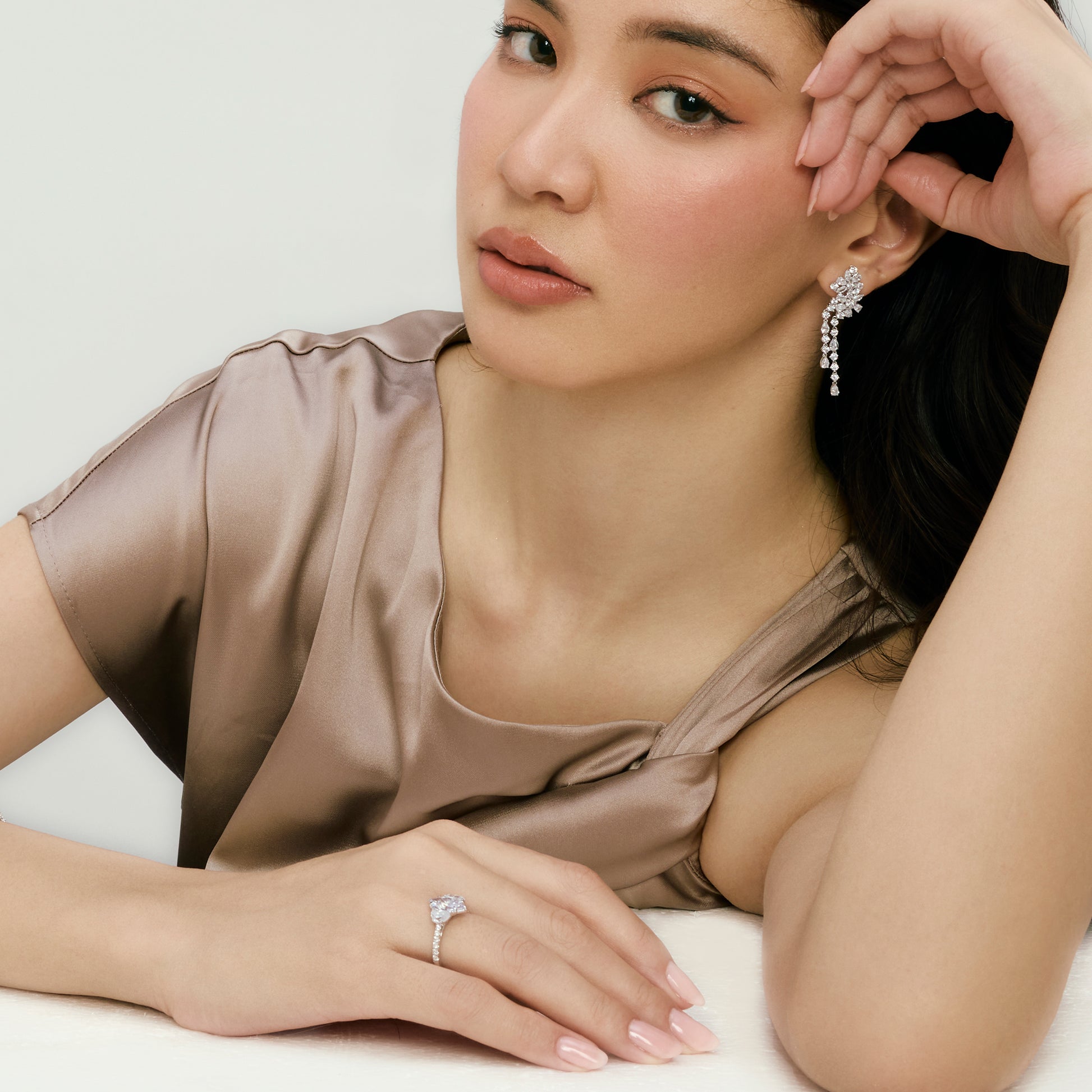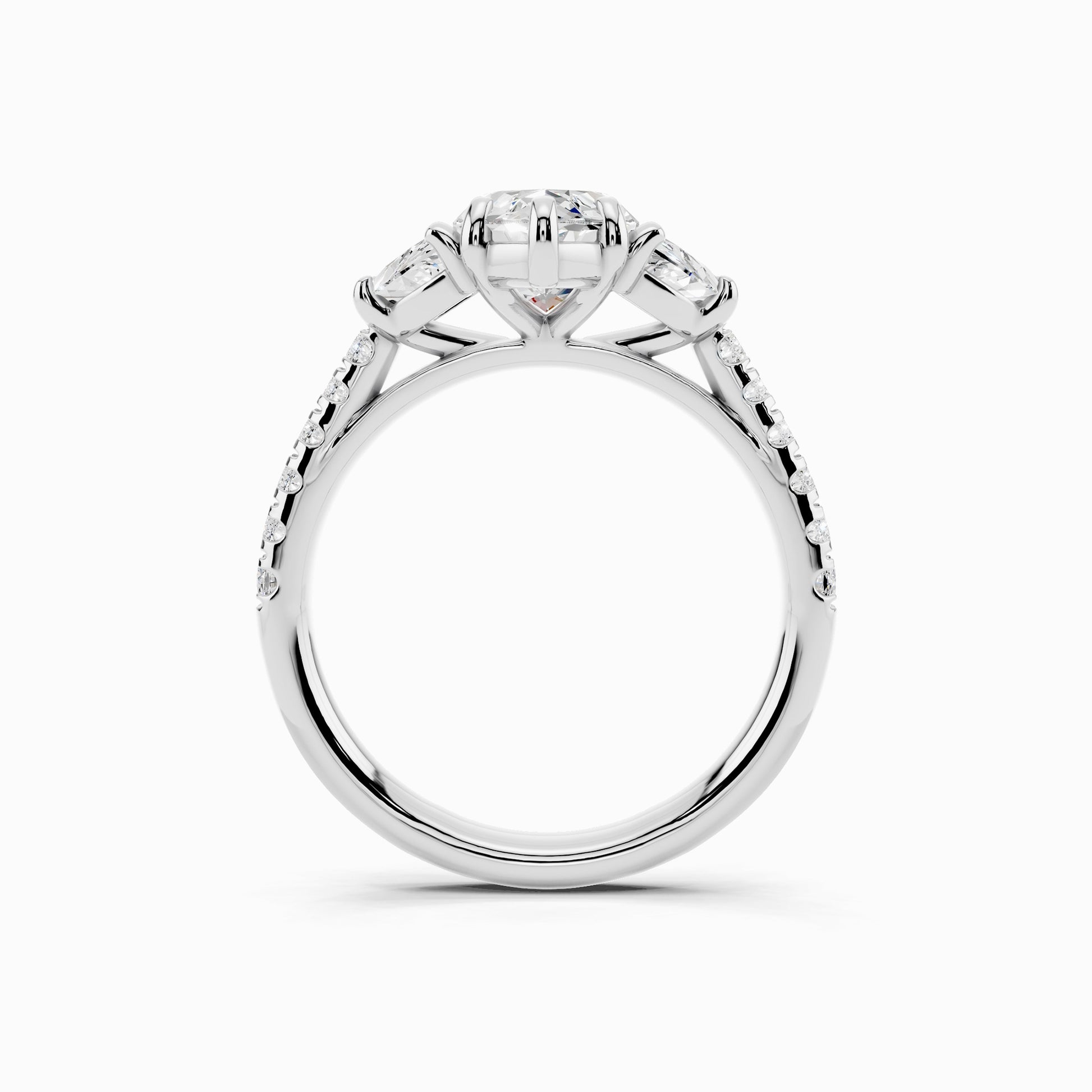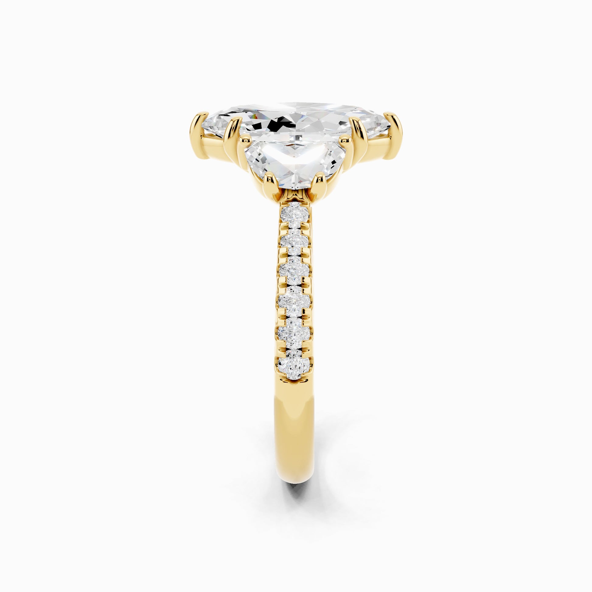 The 3.22 carat Zyla engagement ring features a 2-carat marquise cut lab grown center stone, flanked by half-moon diamonds that cradle it in perfect harmony. The band, adorned with a continuous line of round-cut diamonds, adds a luminous flow symboling the promise of love in its most dazzling form.